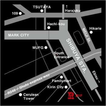 渋谷The RoomのMapです。JR渋谷駅から徒歩5分以内。すき家の地下です。