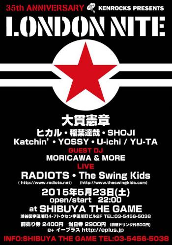Blogby 大貫憲章 2015/04/29 by 大貫憲章 いよいよです!都内でのロンナイ! いよいよです!都内でのロンナイ、2月のわたしの誕生会を兼ねた&NUGGETSも兼ねたCLUB ASIA以来になります。 でも、アレはアレ。大貫64周年X LONDON NITE 35周年でした。今回は純粋なロンナイで、… 2015/04/27 by 大貫憲章 5月はゴールデン・ウィークだけじゃない!!ですよ〜 すでに黄金週間、俗にいうゴールデン・ウィークがもう始まりました〜! 毎年この時期になると、日本全国うかれた気分になります。まさにフィーバーですね。 でも、ぼくらにとって、何もこの時期だけが「お楽しみ」期間というわけじ… 2015/04/13 by 大貫憲章 日本にもかっこいいバンドはいっぱいいる。例えばこの4人組The Stompin’ RiffRaffsとか! 日本にもかっこいいバンドはいっぱいいる。そんなことはみなさんご承知ですね。 でも、知らないものは知らないというのも一面事実で、全部を分かっている者など、神様でもない限りひとりもいないだろう。 自分もそういうひとりだ。… 2015/04/06 by 大貫憲章 4月18日 LONDON NITE in 足利 今月半ばに迫りました。久しぶりの栃木県は足利です。 お世話になっているクラブの周年記念とロンナイとのコラボですが、ひとりティアドロップスの柳川くん(ボーカル)とDJ COBRAの掛け合いは、また仲が古いだけあって伝統芸…