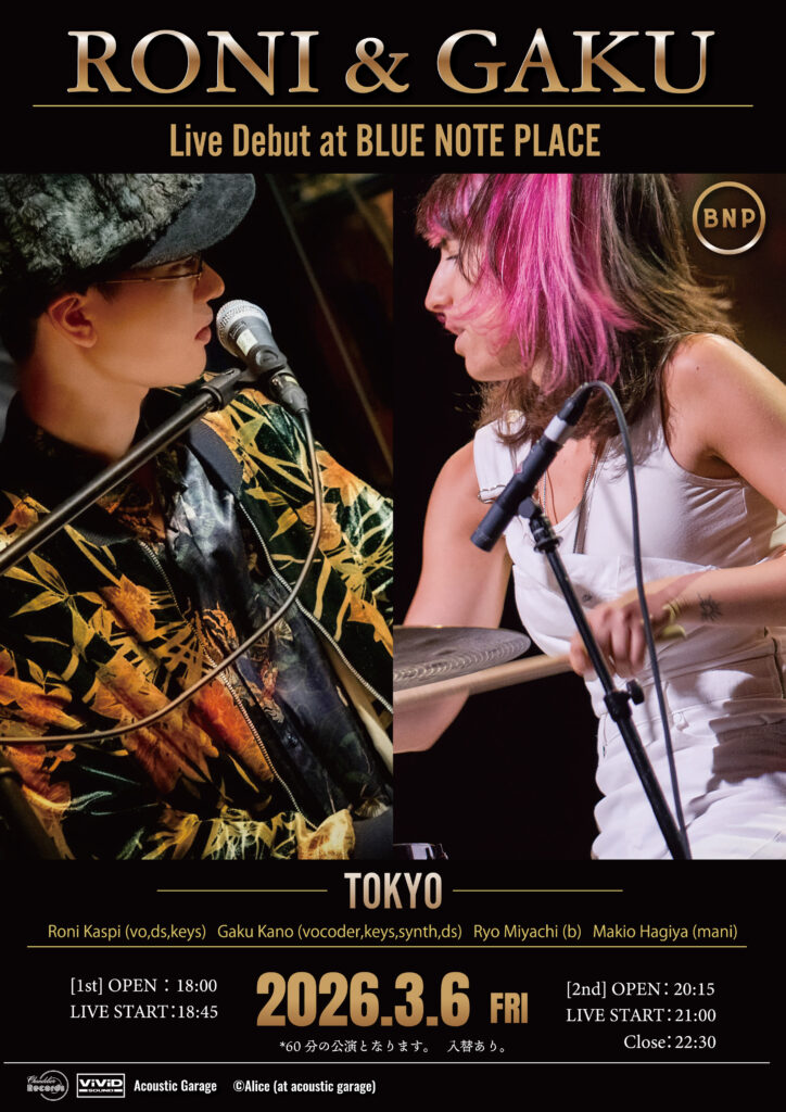 VIVID SOUNDが注目する新ユニット「RONI & GAKU」が、3月6日(金)にBLUE NOTE PLACEにてライブ・デビューを果たします。